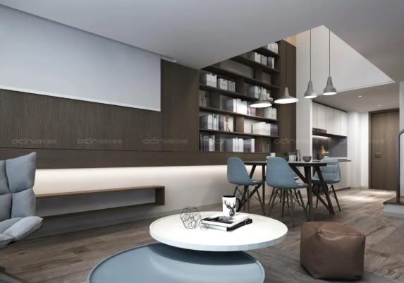 在低飽和度灰調(diào)的鋪敘下,設(shè)計采取不同層次的藍(lán)色作為點(diǎn)綴,勾勒著簡約靈動的空間氛圍,搭配極具藝術(shù)格調(diào)的裝飾小品、材質(zhì)柔軟的布藝沙發(fā),空間呈現(xiàn)出和諧統(tǒng)一的當(dāng)代美學(xué)秩序??紤]到居者的收納需求,充分利用大面積墻體柜的使用,不僅增加空間存儲空間,還提升空間的靈活可能性。靈動組合的擱板讓儲物分類更細(xì)致,同時增添時尚氣質(zhì)。