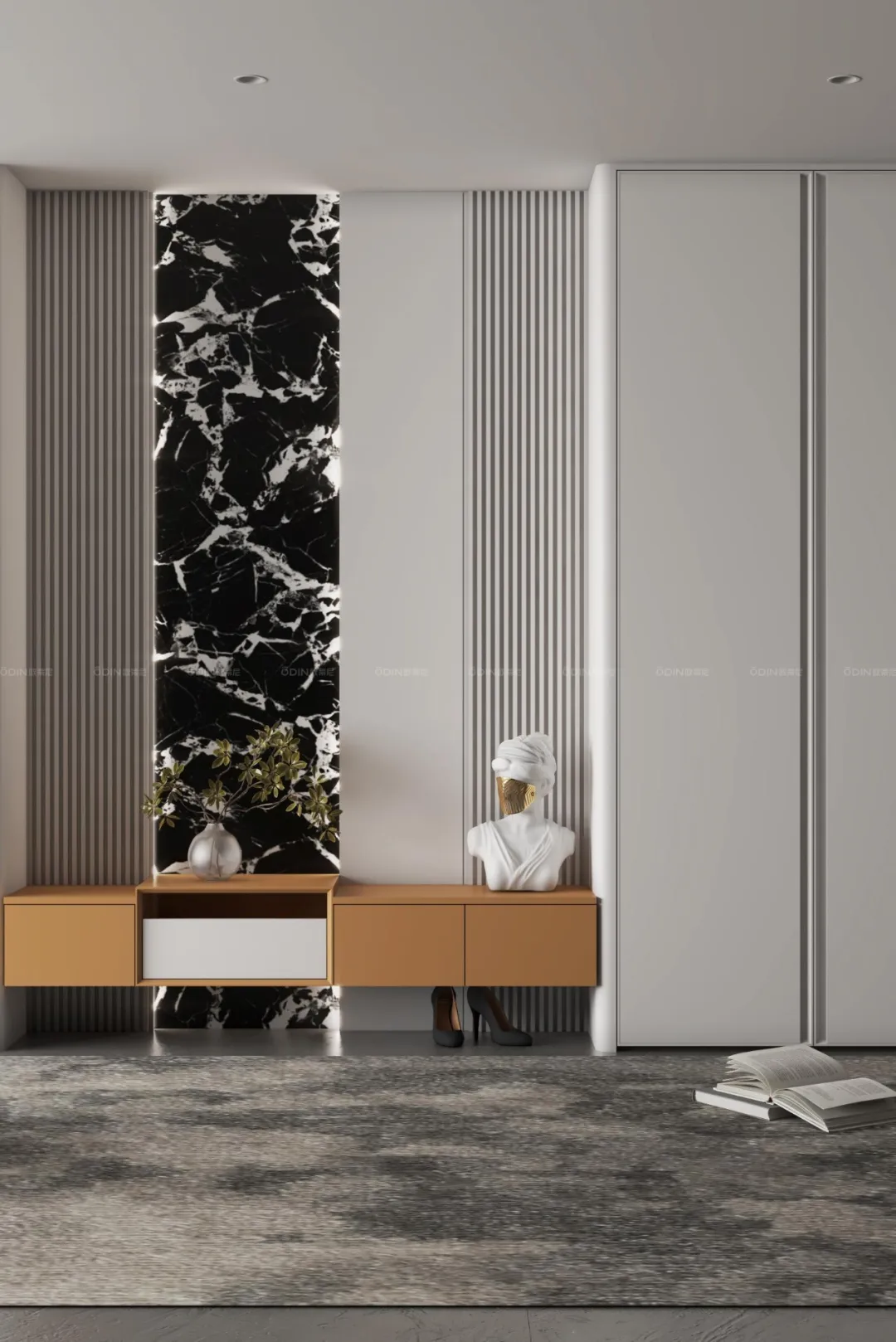 入戶空間被精心設(shè)計(jì)得既視覺(jué)輕盈又層次豐富,其下方采用懸空設(shè)計(jì),巧妙地讓底部留空,營(yíng)造出一種不呆板的靈動(dòng)美感。背墻則巧妙融入了深邃的黑色奢石紋樣和格柵設(shè)計(jì),其獨(dú)特的紋理不僅為空間增添了一抹神秘與深邃,更彰顯出非凡的品質(zhì)與奢華感,讓人一進(jìn)門便能感受到與眾不同的高端氛圍。