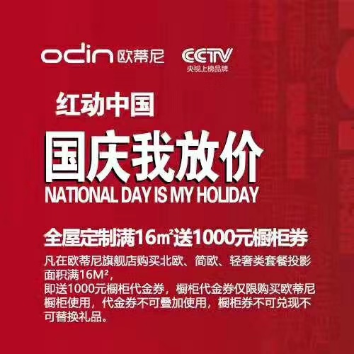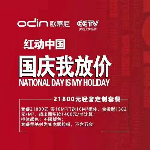 每年的十月一日是一年一度的國(guó)慶節(jié),是我們偉大祖國(guó)母親的生日。伴隨著風(fēng)風(fēng)雨雨,我們的母親祖國(guó)已經(jīng)70周歲了,在這個(gè)舉國(guó)歡慶的日子里,歐蒂尼全屋定制已經(jīng)展開(kāi)了“國(guó)慶我放價(jià)”的主題活動(dòng),這即將是今年活動(dòng)力度最大的一次優(yōu)惠活動(dòng)。